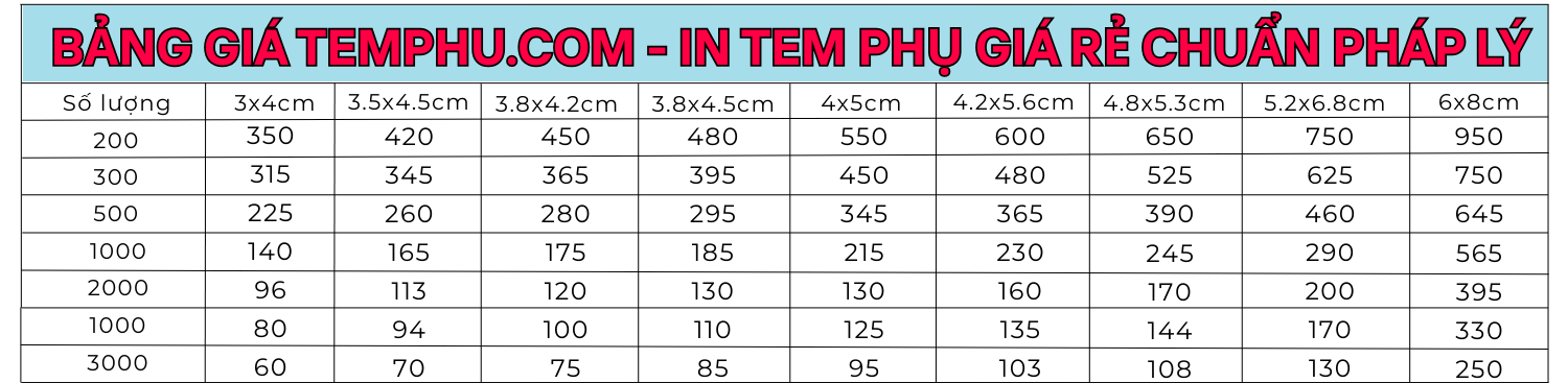 BẢNG GIÁ IN TEM PHỤ MINI VUÔNG